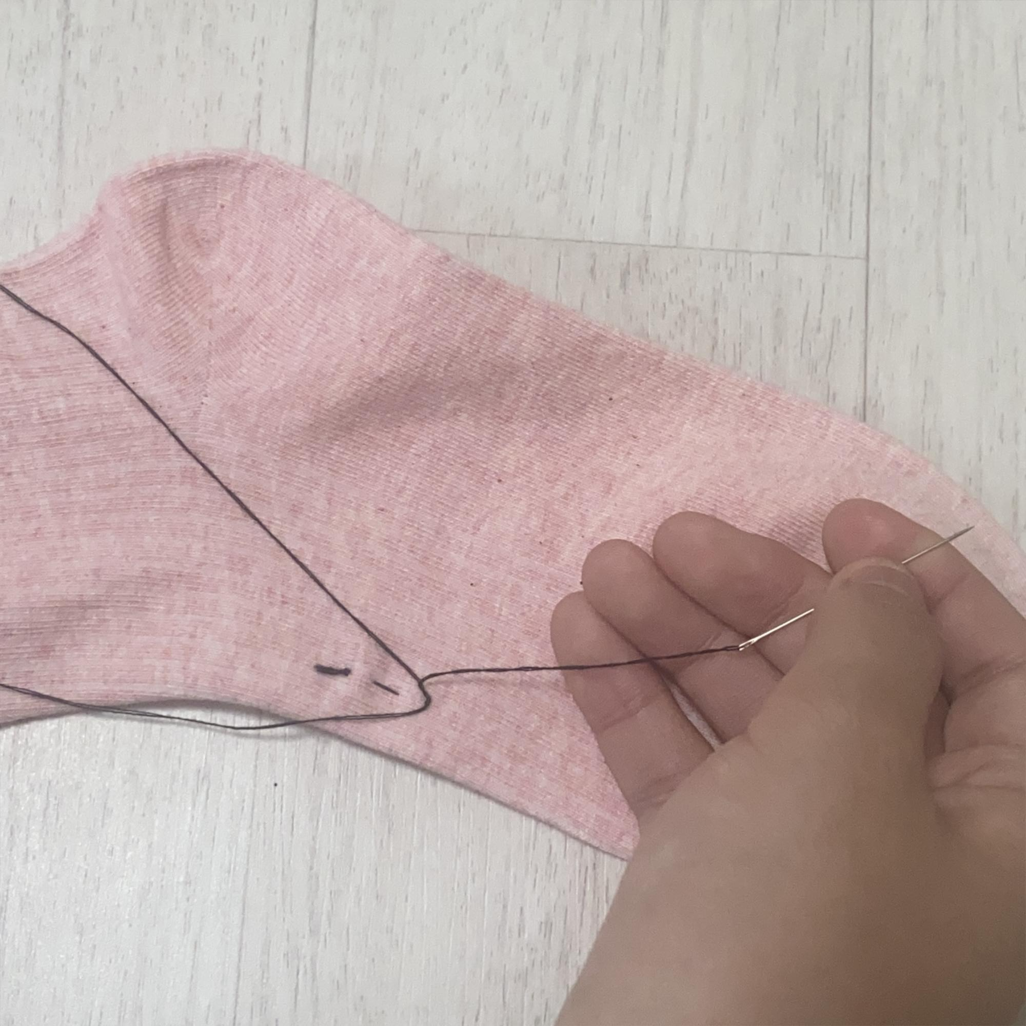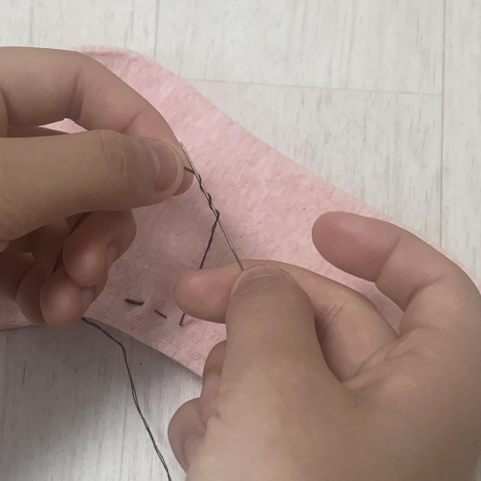 그리고 바늘을 왼손에 있는 실에 걸어줍니다